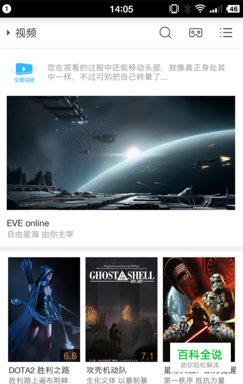 KolorEyes KolorEyes是一款国外的专业360°全景视频播放器,同样提供在线片源、陀螺仪/触控控制和本地视频播放,还可切换一些个性的播放模式,甚至可以直接输入网址下载片源。缺点是未汉化,资源单一,清晰度低,本地视频需放在指定文件夹才可播放。 *小贴士:将全景视频放入手机中的Movies/KolorEyes文件夹(若手机没有这个目录需自己建立),然后进入app点local videos即可观看。