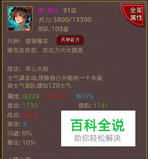 在风云天下中武将是游戏的灵魂,无论是推图还是打架都离不开,随着游戏的日新月异,各种神将纷纷来临,今天就要介绍一下这位给力的武将:嫣·蝉儿 嫣·蝉儿:平原城守之女,城破时出逃,后随一代豪杰踏上征战天下的霸业之途 满属性:统228 勇193 智175 招募费用:10000 兵种介绍:雕车改良型,巨有超强的攻击力 战法介绍:士气满发动,使除自己外随机一个未振奋士气部队增加120士气 攻击系数:1105普防系数:860战防系数:805策防系数:435闪避:0%抵抗:0%暴击:10%反击:0% 嫣·蝉儿虽说是一名女将,但是胆识过人,英勇善战,三国时期毫不逊色于其他壮汉猛将! 游戏中蝉儿起到副将的作用,可以给战法将带来一次120点的士气加成,同事他的普通攻击伤害也非常地高,一般建议新手朋友们可以升级他的武器装备,尽量把嫣·蝉儿做到高防御,高普攻的良将,希望今天的讲解能够给你带来帮助!