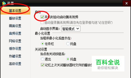 腾讯视频开机自动启动的设置方法 2025-05-22 18:15:37 腾讯视频更换皮肤的方法 操作方法 01 首先我们运行腾讯视频软件。 02 然后我们点击设置按钮→并选择设置选项,如图: 03 在基本设置选项卡中勾选开机自动启动腾讯视频的选项,然后点击底部的确定按钮,如图所示: 赞 (0) 相关推荐 如何关闭腾讯视频开机自动启动功能 腾讯视频是现在十分常用的一款视频播放软件,有些用户想知道如何关闭软件开机自动启动功能,小编就给大家介绍一下具体的操作步骤.具体如下:1. 首先第一步根据下图箭头所指,找到并双击[腾讯视频]图标.2. ... 如何取消腾讯视频开机自动启动 请点击设置菜单。 出现基本设置选项,您可以选择是否“开机时自动启动腾讯视频播放器”。 怎么关闭电脑版腾讯视频开机启动功能 现在有很多人喜欢在电脑上使用腾讯视频看电视.电影,有些用户想知道怎么关机软件开机启动功能,接下来小编就给大家介绍一下具体的操作步骤.具体如下:1. 首先第一步根据下图箭头所指,找到并双击[腾讯视频]图 ... win8系统禁止开机自动启动浏览器的方法 之前小编和大家探讨过很多关于win7和win8的不同之处,当然是各有春秋的,win8在界面和功能上都所有改动,在界面上的改动最为明显的估计就是桌面上的开始菜单了,win8取消了开始菜单的设置,除了这个 ... 如何查看腾讯视频共享设备并设置主设备 腾讯视频是现在比较热门的一款视频播放软件,有些用户不知道如何查看腾讯视频共享设备并设置主设备,接下拉小编就给大家介绍一下具体的操作步骤.具体如下:1. 首先第一步打开手机中的[腾讯视频]App,进入[ ... 讯飞输入法电脑版设置方法教程以及讯飞输入法设置常见问题 本文主要介绍了讯飞输入法电脑版设置方法教程以及讯飞输入法设置常见问题,有需要的朋友可以一起学习一下 讯飞输入法设置其实是很简单的,对于初次使用讯飞输入法的用户,可以查看本站关于讯飞输入法的详细图文教程 ... bios设置电脑定时自动开机/关机的设置方法图文教程 电脑是办公学习的必备用品,如果电脑能够定时开机,当你需要用到电脑的时候就不用等待开机,帮你节省更多的时间.今天给大家带来bios设置定时开机的方法,下面一起来看看如何通过设置bios实现电脑自动开机. ... PC端腾讯视频下载目录如何设置修改 今天给大家介绍一下PC端腾讯视频下载路径如何设置修改的具体操作步骤.1. 打开电脑上的"腾讯视频".进入主页后,选择上方靠右侧的"登录",选择QQ或者微信账号登 ... PC端虎牙直播的开机自动启动如何设置 相信很多人都选择使用虎牙直播进行直播,但是每次都要找到APP再打开,很麻烦.今天就给大家介绍一下PC端虎牙直播的开机自动启动如何设置的具体操作步骤.1. 打开电脑,然后在桌面找到虎牙直播APP,双击打 ...