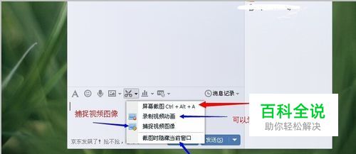 首先认识一下QQ截图工具栏的位置,QQ截图在聊天窗口的菜单栏上的小剪刀 如图 直接点击剪刀 就进入截图模式 点击剪刀后面的三角号 就会出现 截图菜单 (备注①) 快捷键是Ctrl+Alt+A 新增了录制动画 视频捕捉 最下面的菜单式 截图时隐藏当前聊天窗口