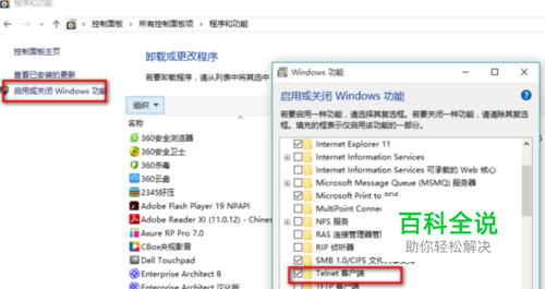 首先我们在windows10系统下,安装telnet客户端。在控制面板-->程序和功能-->启用或关闭Windows功能处,选择Telnet客户端。点击确定进行安装。