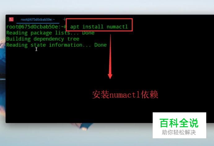 接下来打开Ubuntu中的命令行,执行apt install numactl安装MySQL的依赖库numactl,如下图所示