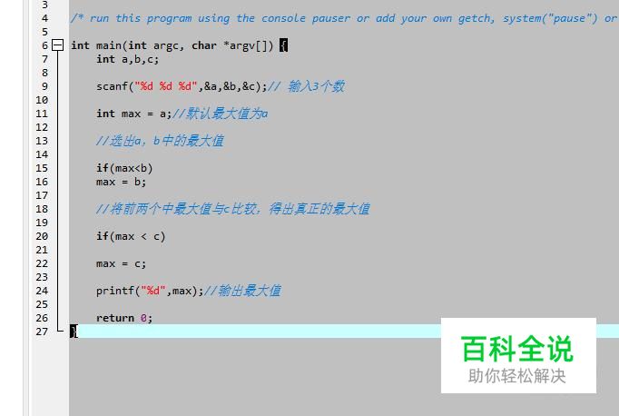 接下来在C语言文件中输入如下图所示的代码,主要是先随机输入三个数,然后进行比较