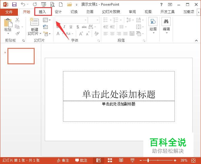 将PPT这款软件打开,然后在菜单那里找到插入选项,如图所示:
