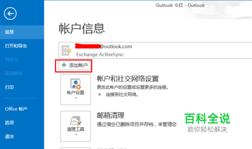 首先登录到Microsoft Office Outlook2013邮箱中。找到 账户信息,点击下面的 添加账户按钮(为保证个人信息安全,图片已经处理过了)。