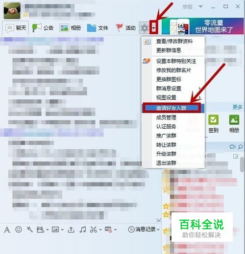 进入到群的对话框后,点击“设置”后面的小三角(一定得点小三角才可以出来啊)--点击“邀请好友入群”。