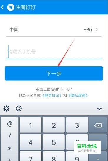 在注册钉钉界面上,我们输入手机号码,然后点击下一步,如下图所示。