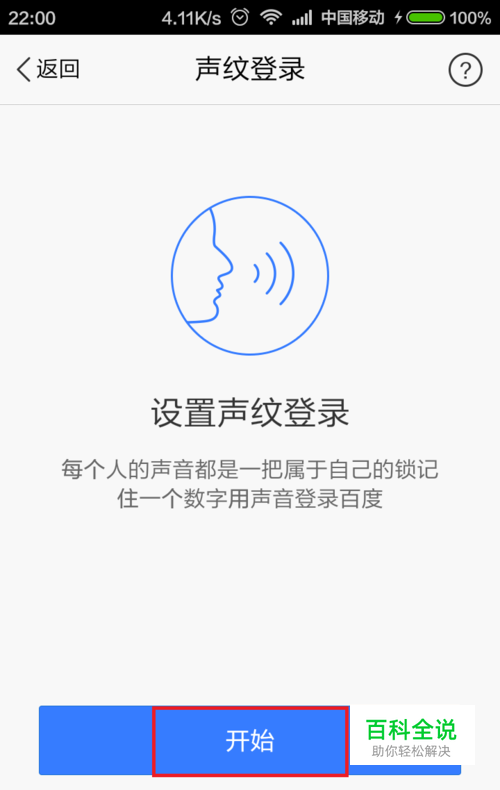点击“ 声纹登录”按钮之后,我们将跳转到声纹登录设置页面,在该设置页面中,点击“ 开始”按钮,进入声纹登录设置页面,首先我们需要的是选择一个密保数字。