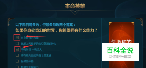 2、第二题,我们选择第二个和第五个选项,这是因为即使冲在前面,也可以利用自己灵活的既能躲避敌方的伤害,它的R可以很好地收割敌方残血英雄。