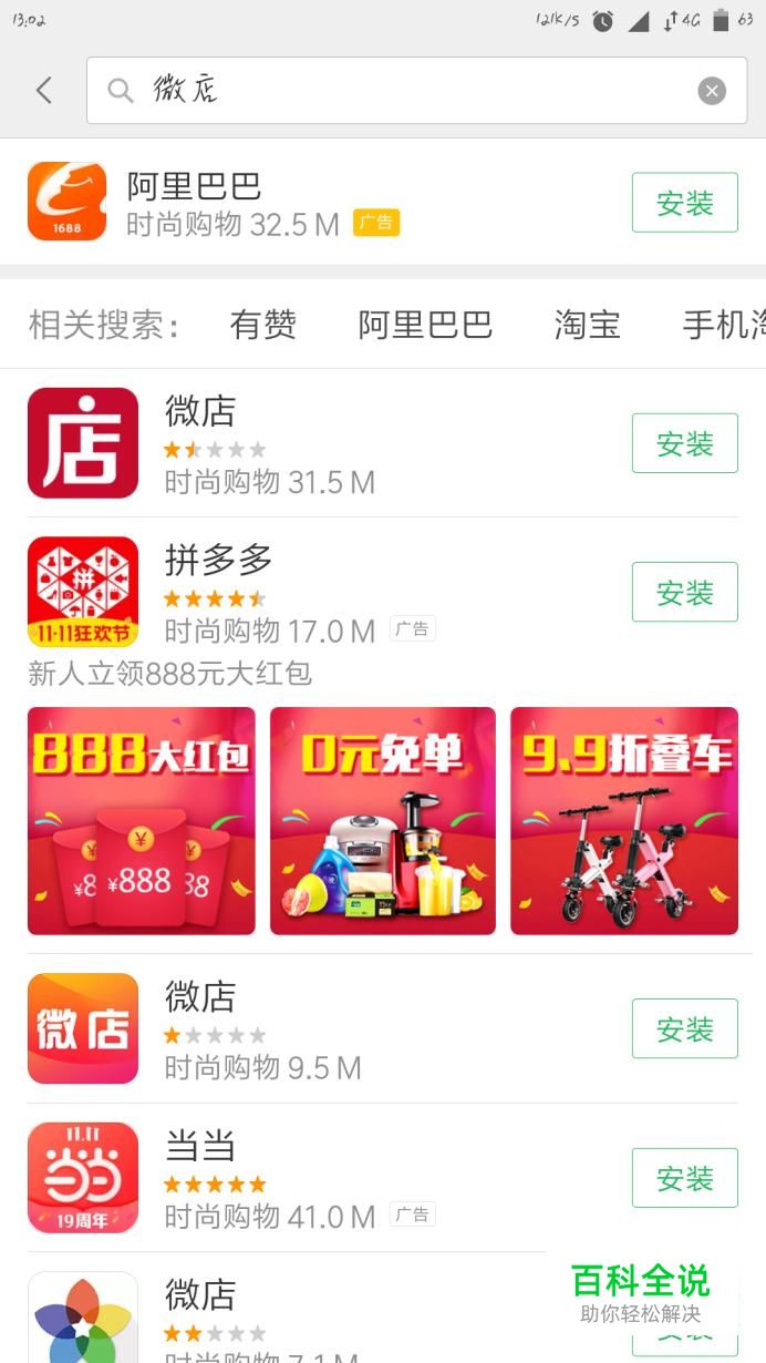 输入“微店”搜索以后我们可以看到“微店”这个软件,点击“安装”,然后等待安装完成。