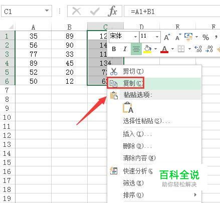 输入好公式以后按下回车键得到计算的结果,然后再使用鼠标左键拖放下来就得到了所有的计算结果,将所有的结果全部选择,单击鼠标右键找到复制选项,如图所示: