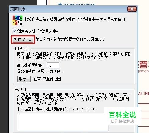 排序助手第二步,印章一,就是第一台页子的正面,16开拼8开骑马钉,第一页和最后一页,第二页和倒数第二页连一起,折手是这样的64-1,2-63,所以按64-1填即可,确定,页面顺序就排好了。继续下一步