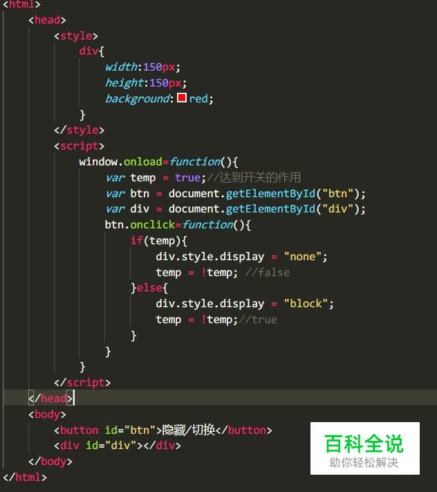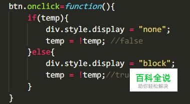 获取button和div的节点 btn点击的时候判断temp,如果temp等于true div的样式就看不见 temp的值=取反 也就是这会temp = false