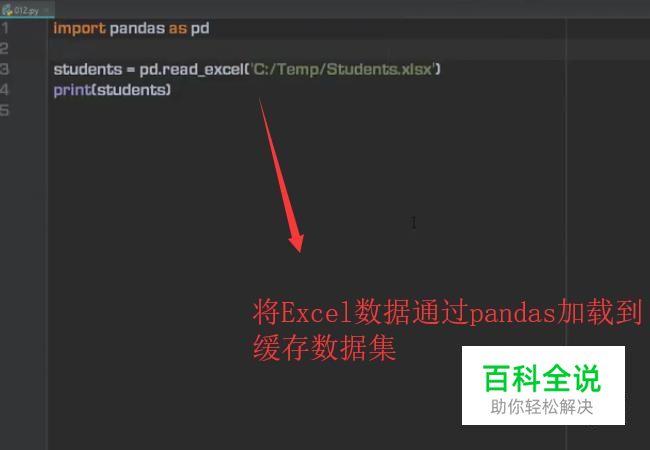 接下来我们打开Pycharm,新建Python文件,导入Python的pandas库,利用pandas将Excel数据加载到缓存中,如下图所示