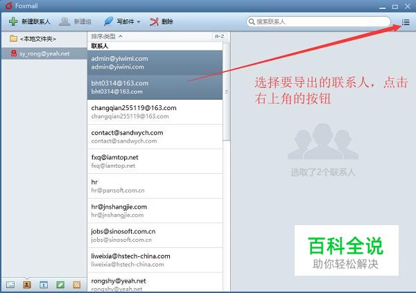 接下来在联系人列表中选择要导出的联系人,如果要全选的话可以按Ctrl+A组合键,然后点击右上角的按钮,如下图所示
