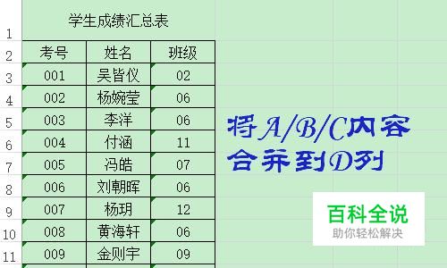 比如下图一是一张学生成绩表,想要将学生的考号、姓名以及班级这些数据合并到D列,那么应该如何操作呢?