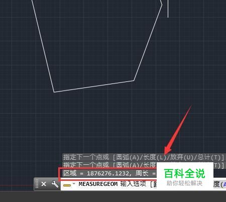 将起点和终点闭合后,按下回车键在提示信息里我们就可以看到这个图形的面积和周长就计算出来了,如图所示: