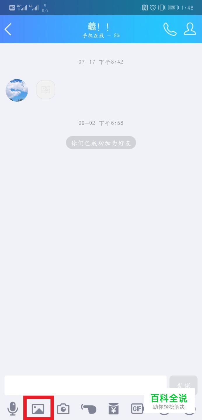 首先利用手机上美图秀秀等P图APP制作表情包,并将制作好的表情包置于手机相册中。打开想要发送表情包的好友的对话框,在下方选择发送图片。