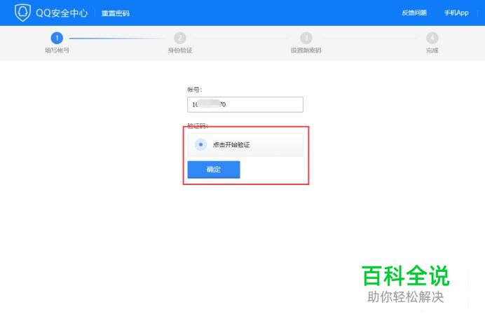 点击进入QQ安全中心,在网页中输入要找回密码的QQ帐号,点击确定按钮进入下一步。