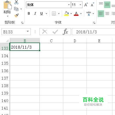 比如,在B133单元格输入日期,如下图所示。