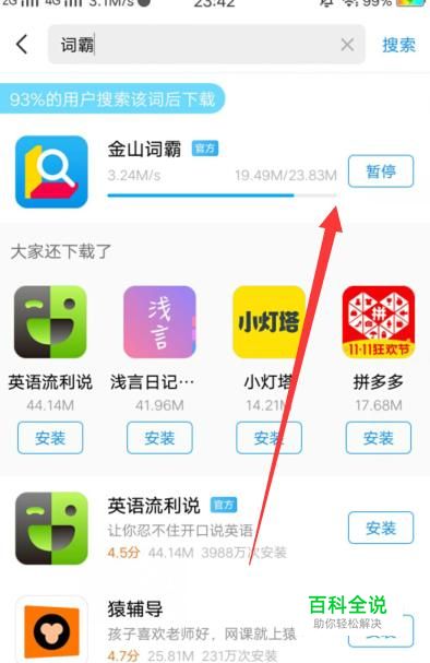 进入之后,搜索“金山词霸”将其安装到手机上面,如图所示。