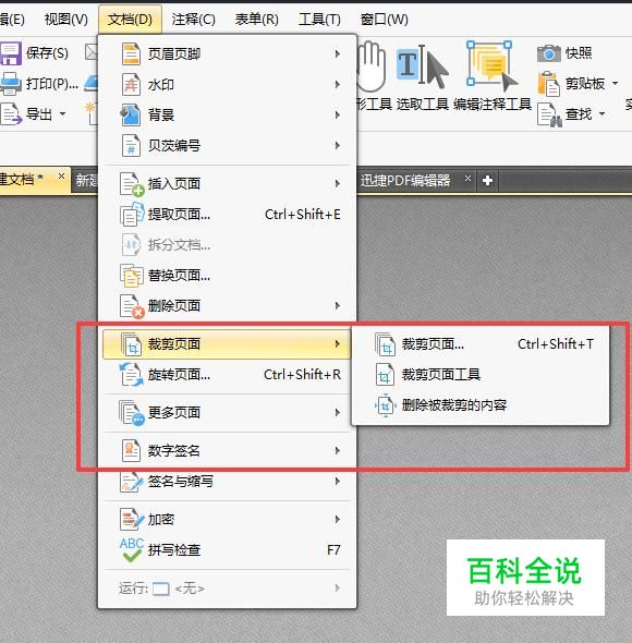 点击菜单栏中的文档,然后选择文档中的裁剪页面,在裁剪页面工具中有裁剪页面,裁剪页面工具以及删除被裁剪内容三个选项,点击裁剪页面。