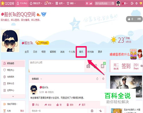 打开你的QQ空间,你会看到导航栏上面有“音乐”这个选项。点击打开进入音乐类页面。