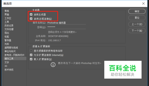 打开PS,点击编辑>>远程连接:如下图,勾选启用远程连接,点击确定。重启PS,为下面做准备。