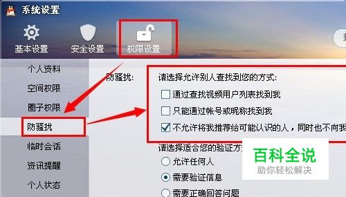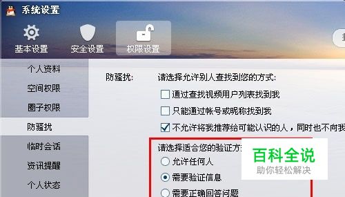 请选择适合你的验证方式 取消允许任何人 一下三条根据自己的需要勾选 需要验证信息 需要正确回答问题 需要回答问题并由我确认 如果你选择需要正确回答问题,在设置问题框中,输入问题,设置答案,只有正确输入答案才能加为好友