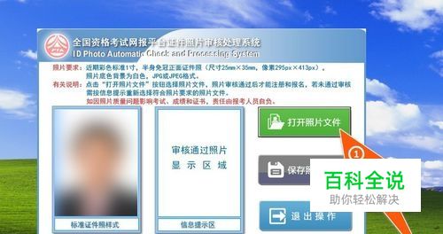 打开证件照片审核处理系统后,如果要上传照片,那么先点击右侧的“打开照片文件”(注意先看上方的“照片要求”和“有关说明”)