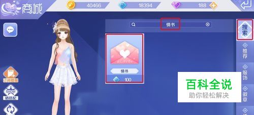 【购买道具】 我们在搜索框内输入“情书”确认后搜索,出现道具, 点一下会有“购买”按钮,花费100点券购买一个情书道具。
