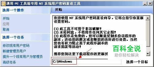 进入Win PE系统界面后,打开桌面“Windows用户密码修改”程序或者开始菜单可以找到,点击右下角“选择一个目标”,找到系统的安装目录,比如C:\Windows。