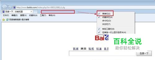利用浏览器自带管理软件设置: 打开浏览器, 鼠标单击右键, 选择菜单栏, 如果已经选上的可以直接跳过这一步。 选择工具-internet选项