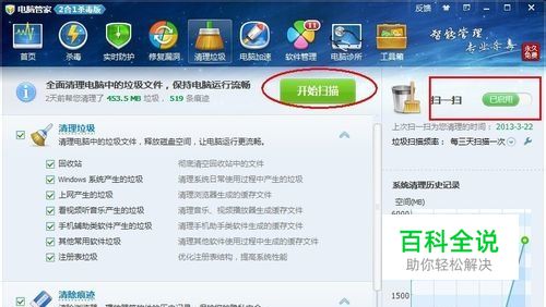 打开QQ电脑管家之后, 选择清理垃圾。开始扫描,系统就会自动清理你浏览网页产生的垃圾文件, 和电脑中其他软件使用过程中产生的垃圾文件。如果经常上网观看视频的朋友, 建议开启右侧的“扫一扫”功能, 软件会每隔三天自动为你的系统进行一次大扫除。