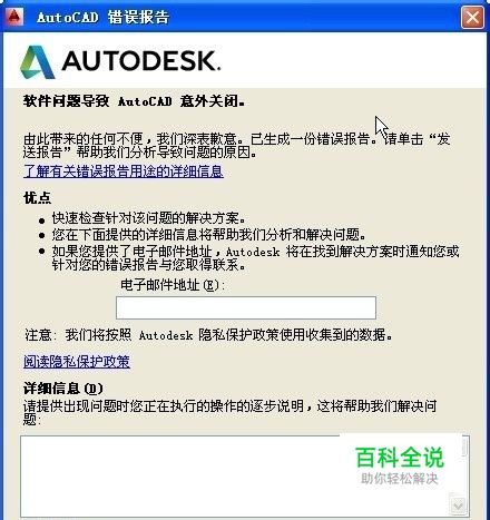 三、遇到了CAD的BUG。 不管那款软件都会有BUG,从WINDOWS到OFFICE,再到CAD。就算是AUTOCAD,估计他们每个版本的问题库也会有几千个甚至上万个问题,只是普通操作触及不到这些BUG。国产CAD推出时间相对较短,开发和测试力量都相对弱一点,遇到软件BUG的几率会稍微高一些。不过,国产CAD经过十多年的发展,现在的版本也相当稳定了,大家要对国产CAD给予信心和支持。 如果确认自己的图纸没有问题,但操作过程仍然出现了异常退出,估计是遇到CAD的BUG了。此时也没有什么好办法,可以尝试用其他操作方式替代,看是否能绕过这个BUG。另外,CAD软件在异常退出时会弹出一个发送错误报告的对话框,如下图所示。 我想大多数人看到这个对话框时都会直接关掉。如果用的是AUTOCAD,不发的话我觉得可以。如果用的是国产CAD,建议大家还是将现象描述一下,哪怕在后面加上一句发牢骚的话,最好把错误报告发出去。 错误报告会帮助CAD厂商去发现、分析并解决一些内部测试中未发现的BUG,对提升CAD软件的稳定性很有帮助。如果CAD厂商通过分析发现了死机的原因并解决了这个问题,那你使用下一个版本时就不会遇到相同的问题了。 如果你在使用国产CAD,不要单纯去抱怨,也可以为国产CAD的发展贡献一点力量,国产CAD在国外CAD产品和盗版的夹缝中生存非常不容易!