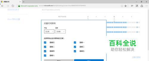 在第 4 步骤图中的右下角,可以点击“设置时间限制”链接,将弹出对话框,统一设置一周或一周内某一天、某几天的成员上网时间设置。这里的设置,与第 5 步骤中某一天的单独设置,是可以叠加的。