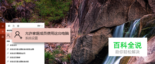 在小娜框中输入“家庭成员”,小娜匹配“允许家庭成员使用这台电脑”,回车或点击,即可进入设置中的家庭管理界面。 也可以点击“开始”——“设置”——“账户”打开相同的界面。