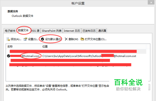 设置账户默认数据文件为上一步添加的账户数据文件,这一步是为了将日历数据保存到Hotmail