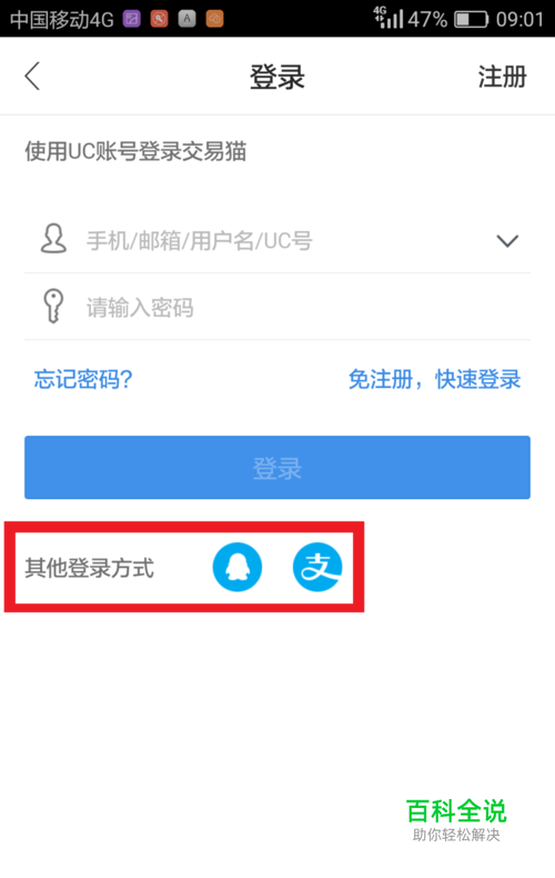 第三步:在进入的界面中的最下方,可以找到“其他登录方式”(详见图片红圈内),在“其他登录方式”中点击qq那个蓝色的标识,进入下一个界面;