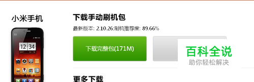 首先大家要下载最新的卡刷包,在MIUI官网下载,选择“下载”-“小米手机”-“下载完整包(1xxM)”。这个就是线刷包。至于卡刷包要另外下(就是以fastboot结尾的exe文件,在这里我们不做讨论)。把这个文件保存到你的电脑里。