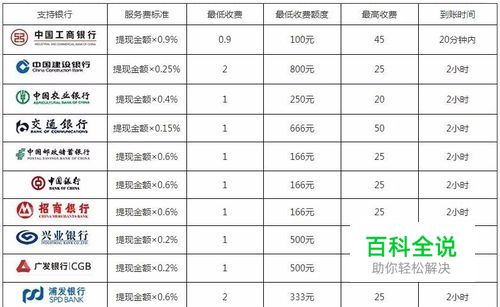 问:提现到底收多少钱手续费? 答:每个银行收取的提现费用都不同。详情参照下图表格。 PS: 最低收费额度的意思是,额度内提现都按最低收费计算,不再额度范围内的按提现金额的百分比计算。 如:农业银行提现200元手续费是 1元,提现300元则是300*0.4%=1.2元 最高收费是如果手续费大于最高收费,则不管多出来多少都按最高收费收取。 如:中国银行提现5万元则是5万元*0.6%=30元 超过最高收费25元则按25元收取。
