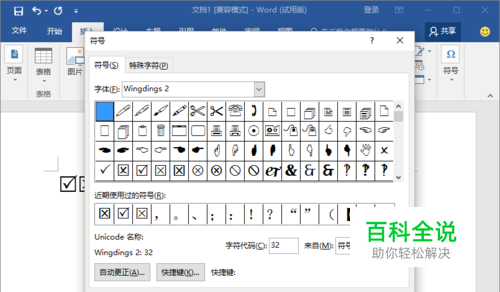5、在符号窗口中,将符号下的“字体(F)”选择为“Wingdings 2”,接着滑动滚动条,找到带“打勾”或者“打叉”的小方框。然后选择需要插入的符号,再点击“插入”按钮。如图所示;