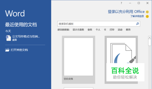 1、在计算机桌面Word2016程序图标双击鼠标左键,将其打开运行。在打开的Word2016程序窗口,点击“空白文档”选项,新建一个空白Word文档。如图所示;
