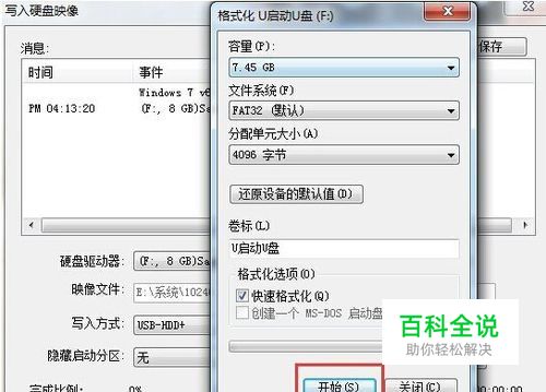 先格式化u盘,点击“格式化”,弹出的询问窗口选择“开始”。