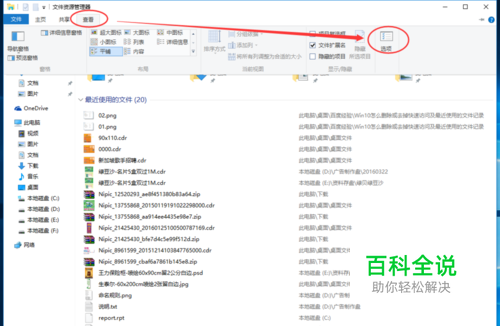 然后我们在资源管理器上点击“查看”,再去找到并点击“选项”,如图2所示。