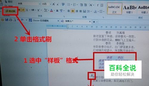 具体操作如下图:1.选中“样板文字” 2.单击“格式刷” 3.拖动刷子去刷目标“文字”