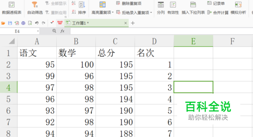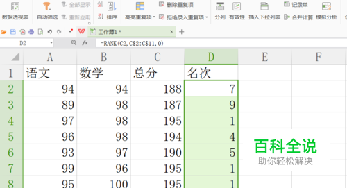 其中,C2是第2行数据总分中的第一个数值195,也就是需要排序的数值。如图所示: