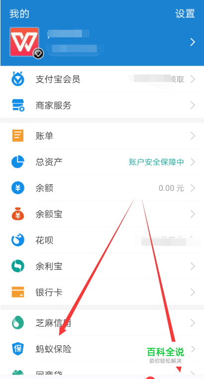 打开支付宝,然后点击支付宝我的选项卡,直接点击我的界面里的【蚂蚁保险】,如下图所示。