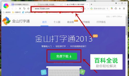 在官网上下载“金山打字通”,“在360软件管家和金山软件管家里也都可以下载”。输入图中网址,打开网页后,点击“下载”。