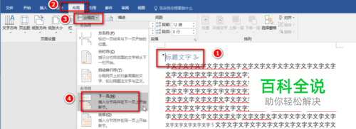 要想在任意页插入任意页码,首先将光标定位到需要设置任意页码的界面(例如第4页),选择“布局”菜单下的“分隔符”,点击“下一页”。
